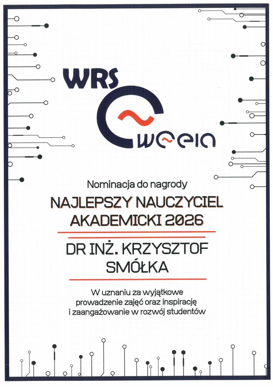✨ Nominacja do Nagrody Nauczyciel Akademicki 2026 - dr inż. Krzysztof Smółka,