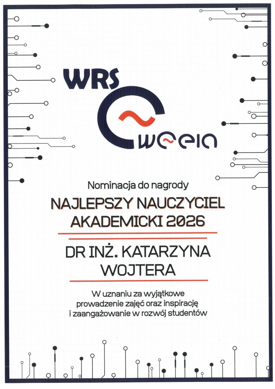 ✨ Nominacja do Nagrody Nauczyciel Akademicki 2026 - dr inż. Katarzyna Wojtera,