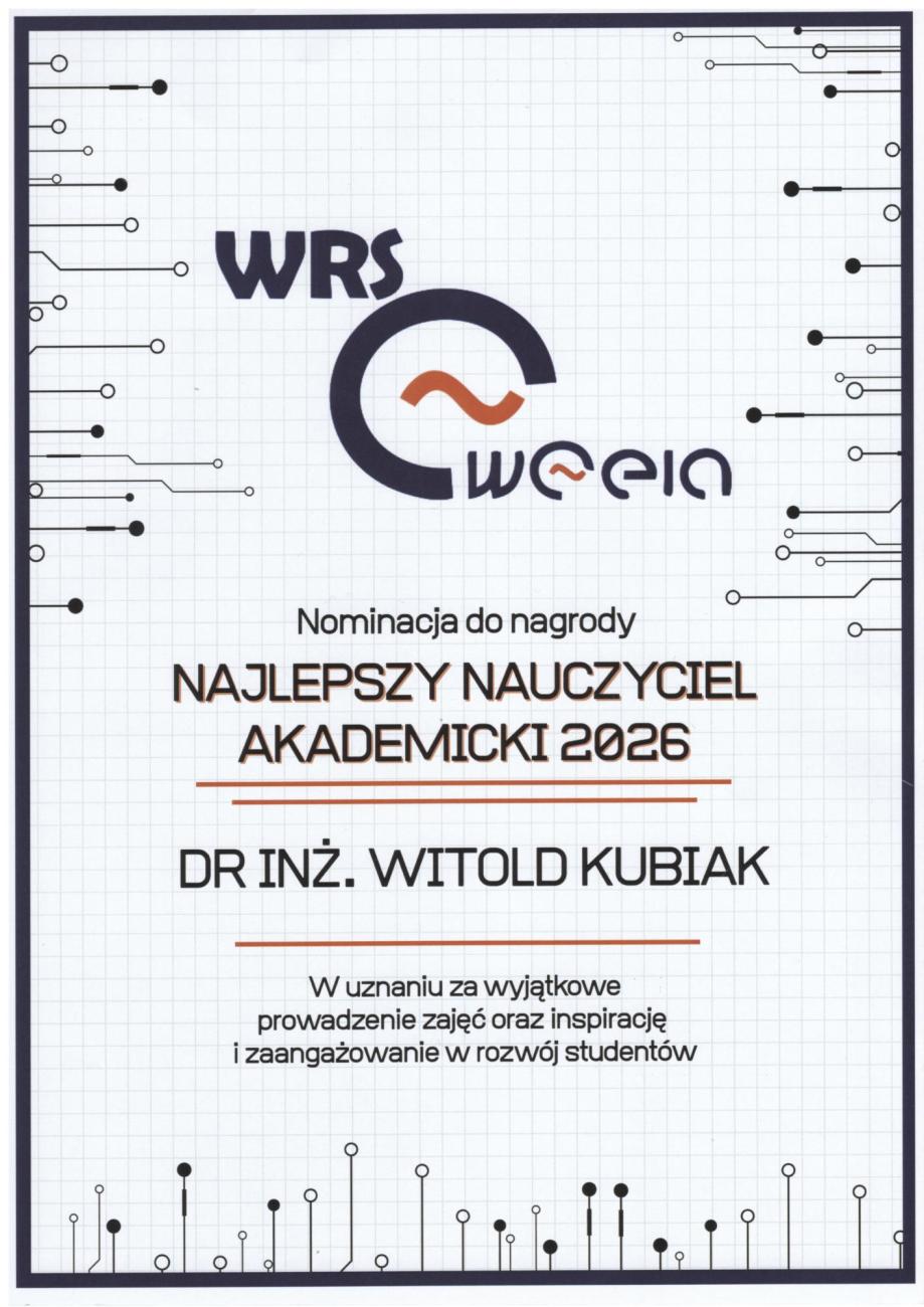 ✨ Nominacja do Nagrody Nauczyciel Akademicki 2026 - dr inż. Witold Kubiak,